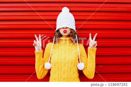 Fashion cool girl blowing red lips makes air kiss wears colorful knitted hat, yellow sweater on red
