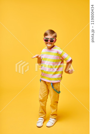 Vertical shot of smiling preteen boy fooling around while dancing in three pairs of colorful sunglasses against yellow background in studio, copy space
