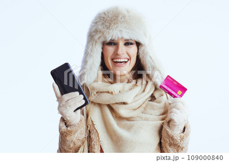 smiling modern woman in winter coat and fur hat on white