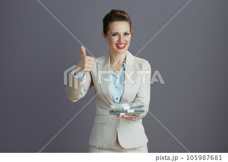 happy stylish female employee in grey suit isolated on gray