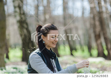 A girl in the park opens a bottle of water. A woman is resting in the forest and sitting with a bottle of water in her hands.
