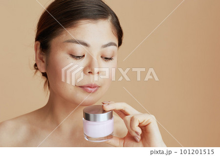 modern asian woman with facial cream jar on beige background