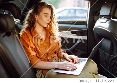 A young curly woman with a laptop sitting in back seat of a car. Beautiful woman uses laptop in car.