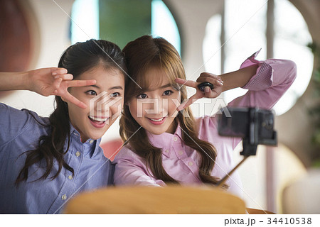 Young girls using virtual reality glasses - people having fun with new technology vr headset