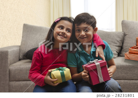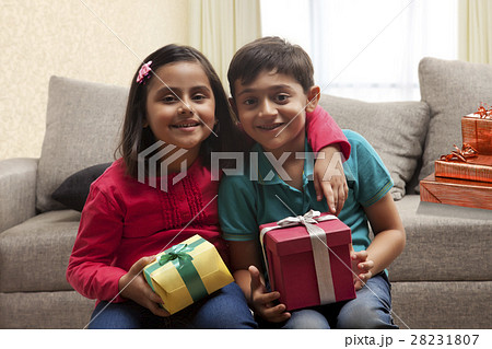 Boy (4-5) sitting on sofa with girl (6-7) holding paper