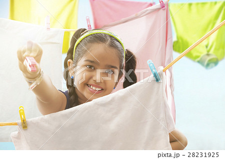 Portrait of teacher indoors, girl (10-11) using microscope in background