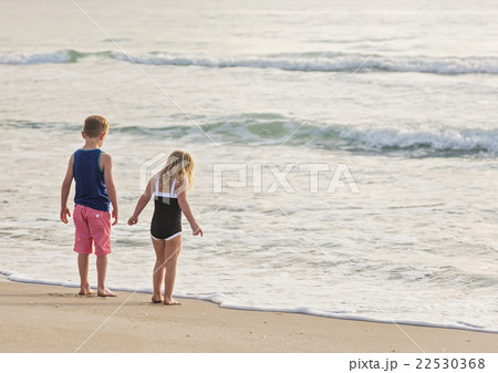 Boy (6-7) and girl (4-5) standing on beach by water holding hands