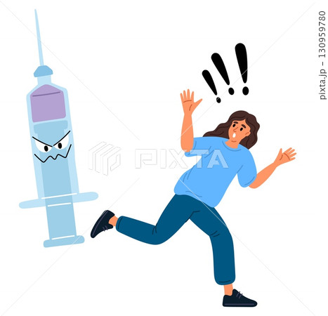 Frightened woman runs away from syringe. Fear of needles. Panicked patient escape. People afraid of vaccination. Doctors with injector. Fearful procedure. Vector jatrophobia concept