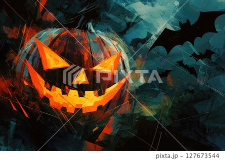 A painting of a pumpkin with a scary face and bats flying around it
