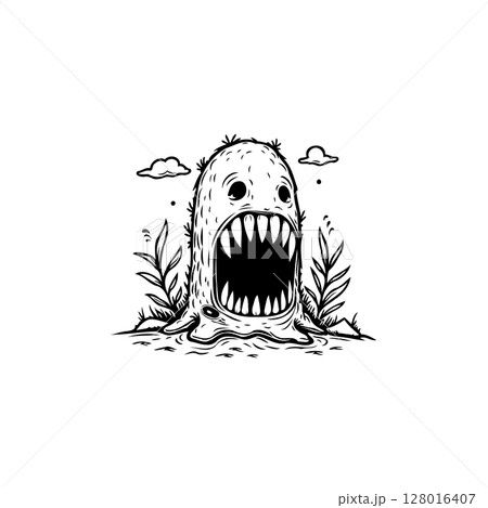 Creepy monochrome cartoon monster illustration with sharp teeth and ominous presence