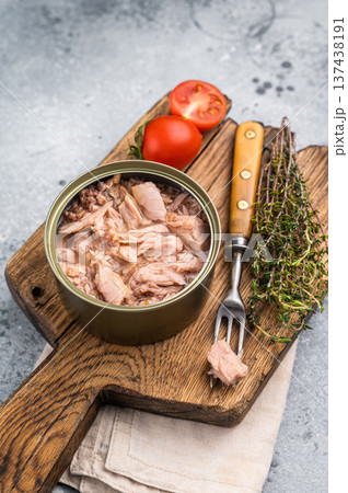Chunky tinned tuna served on a wooden board, perfect for meal prep or easy weeknight dinners. isolated on white background. top view