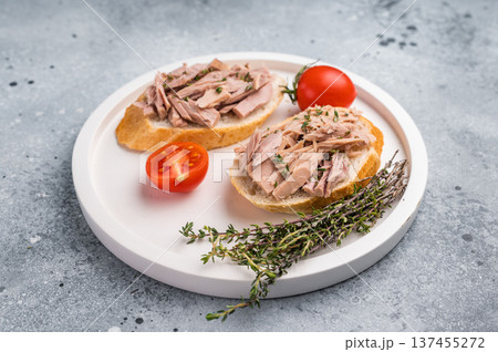 Gourmet style tuna sandwich with fresh herbs and spices, elevating your lunchtime experience to the next level. isolated on white background. top view