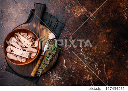 Sustainable tinned tuna fillet in a wooden bowl, promoting eco friendly eating without sacrificing taste. brown background. top view