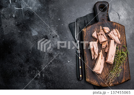 Convenient tinned tuna fillet, perfect for quick meals and packed with protein for a healthy lifestyle. black background. top view