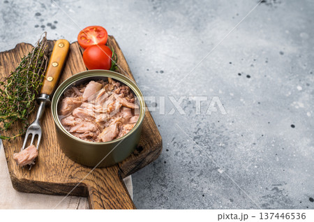 Delicious canned tuna in olive oil, ideal for salads, sandwiches, or as a savory snack on the go. grey background. top view