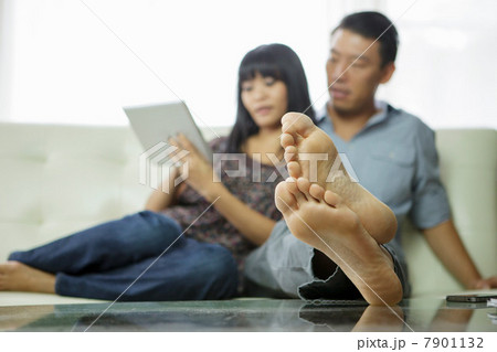 Barefoot girl sitting on grass with tablet-pc and smartphone