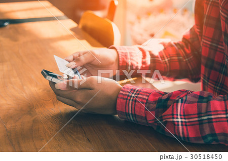 Man buys things online using his mobile phone or laptop. online transactions via application. Online shopping via bank transfer or credit card. Connection by internet. Security safe.