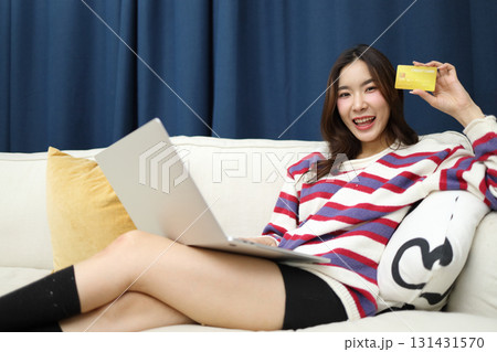 Portrait of young Asian woman using credit card and laptop computer for online shopping.