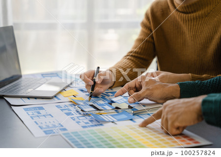 UX developer and ui designer brainstorming about mobile app interface wireframe design with customer breif and color code, User experience concept.