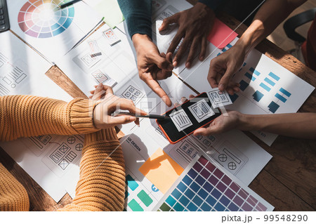 Close up view of brainstorm team of creative Web Graphic Designer ux developer and ui designer brainstorming about mobile app interface wireframe design. top view