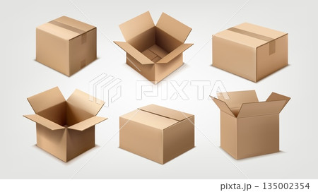 Cardboard box. 3D mockup. Open carton paper parcel different angles view. Realistic package delivery. Brown empty storage or delivery container. Closed transportation. Vector isolated illustration