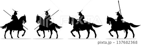 一套四幅戰國時代騎馬武士的剪影,包括一名手持長矛的騎馬武士,全部為可編輯的向量插圖。
