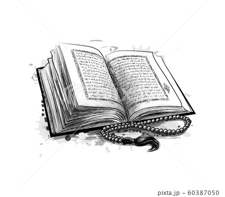Holy book of Koran with rosary. Muslim holiday, Eid Mubarak, Eid al-fitr, Ramadan Kareem. Hand drawn sketch