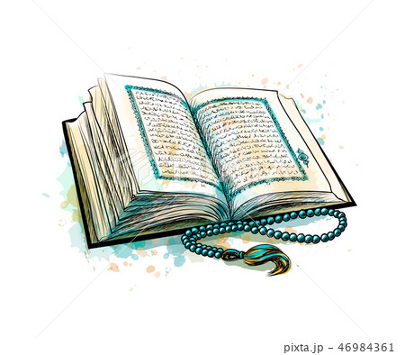 Holy book of Koran with rosary from splash of watercolors. Muslim holiday, Eid Mubarak, Eid al-fitr