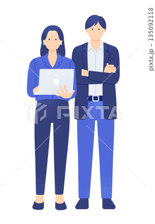 一位女士手持筆記型電腦,一位男士雙手交叉抱在胸前。這是IT工程師或顧問的典型形象。