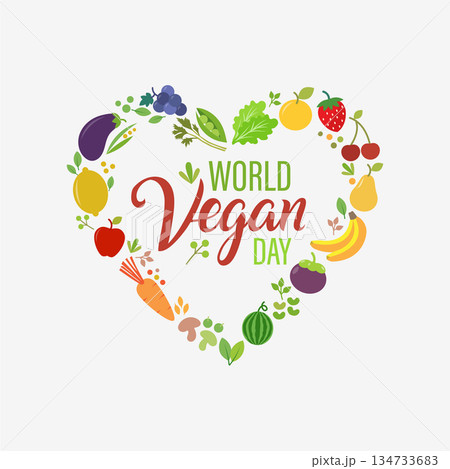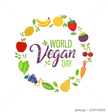 Bright circular design of fruits and vegetables celebrating World Vegan Day, symbolizing health, nature, and plant-based living.