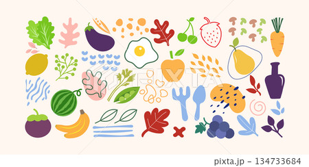 Colorful organic shapes of fruits, vegetables, and leaves forming a playful healthy food pattern in modern flat illustration style.