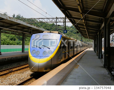 一列火車停靠在台灣的鄉村車站。