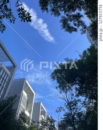 藍天綠蔭下的城市立體交叉風光 | 藍天與立體交叉交叉口,城市綠蔭與建築
