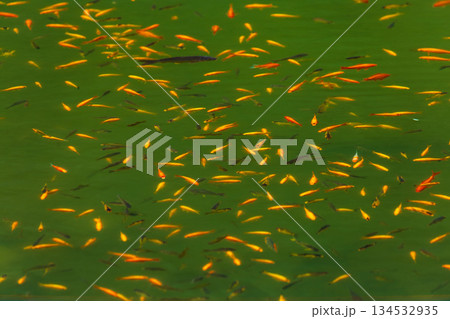 碧綠明池中悠游的金色魚群