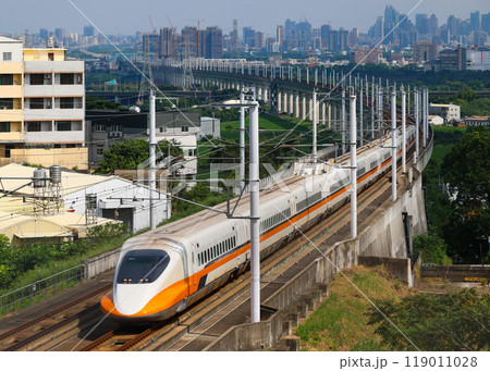 台灣新幹線(台灣高鐵)繞著彎道行駛,背景是城市