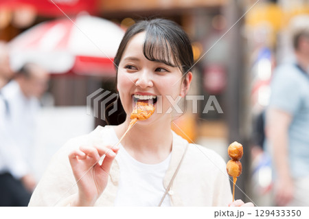 大阪府大阪市道頓堀,一名女子在戶外享用炸串