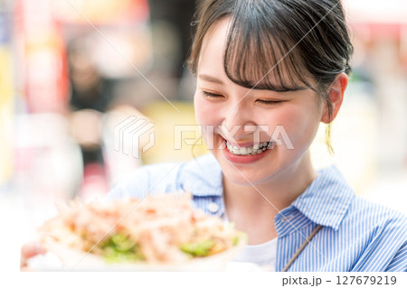 大阪府大阪市道頓堀,一名女子在戶外吃章魚燒