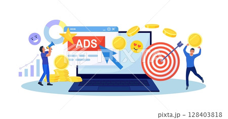 Pay Per Click concept. Advertising marketing in the internet. PPC business, CPC technology, sponsored listing. Tiny characters standing near laptop screen with cursor clicking on ad button. Web search