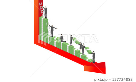 Isometric 3D Business Teamwork Using Ladders and Stacking Banknotes to Climb Up Against Falling Red Arrow Graph for Financial Crisis Recovery, Risk Management and Wealth Protection