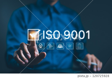 ISO 9001 Certification Concept. Businessman points to ISO 9001 with checkmark icons and quality control symbols, certification, and standardization in quality management. standard quality, certificate