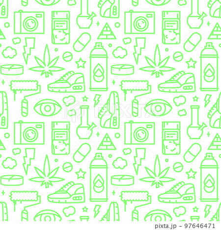 Teenage Street Cannabis Culture Seamless Pattern in Line Art Cartoon Style for Medical Marijuana