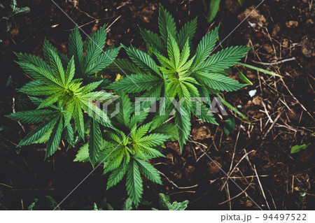 Cannabis bush close-up. Cultivation of hemp fields. Leaves background.