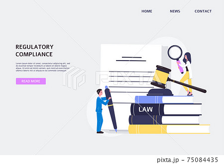 Regulatory compliance website banner with tiny people flat vector illustration.