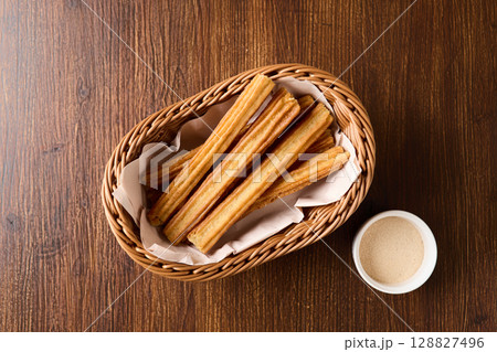 Delicious churros with cinnamon sugar served in basket with chocolate sauce