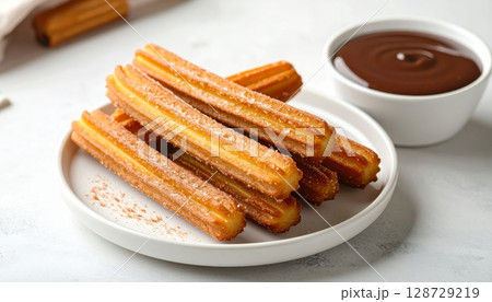 American churros dough sticks sugar flour pastry snack dessert on white plate