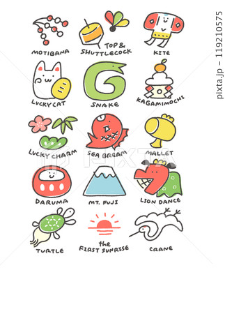 可愛插畫蛇與新年吉祥物賀年片素材2025英文字母手繪線描
