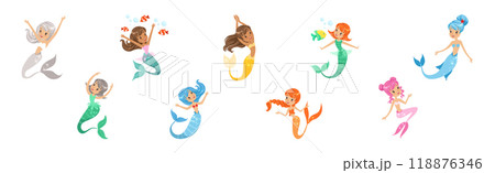 Cute Girl Mermaid Character with Female Body and Fish Tail Vector Set