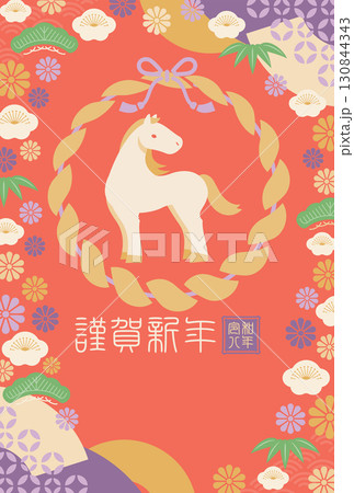 馬年插圖新年設計「Chagu Chagu Umako和幸運符彩色線條畫」方形影印空間