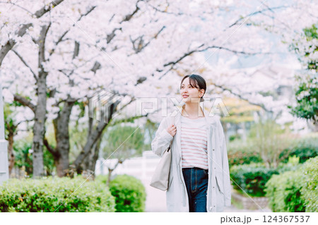 沿著櫻花樹散步的年輕女子