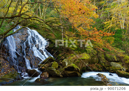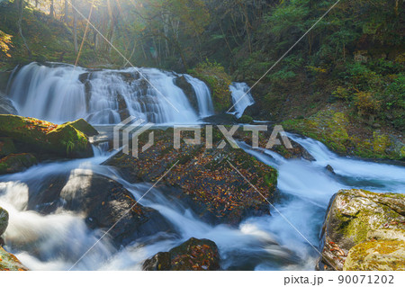 福島縣鮫川村內大小不一的瀑布統稱為翼龍太瀑布,是個壯觀的觀景點。這裡是素門瀑布。